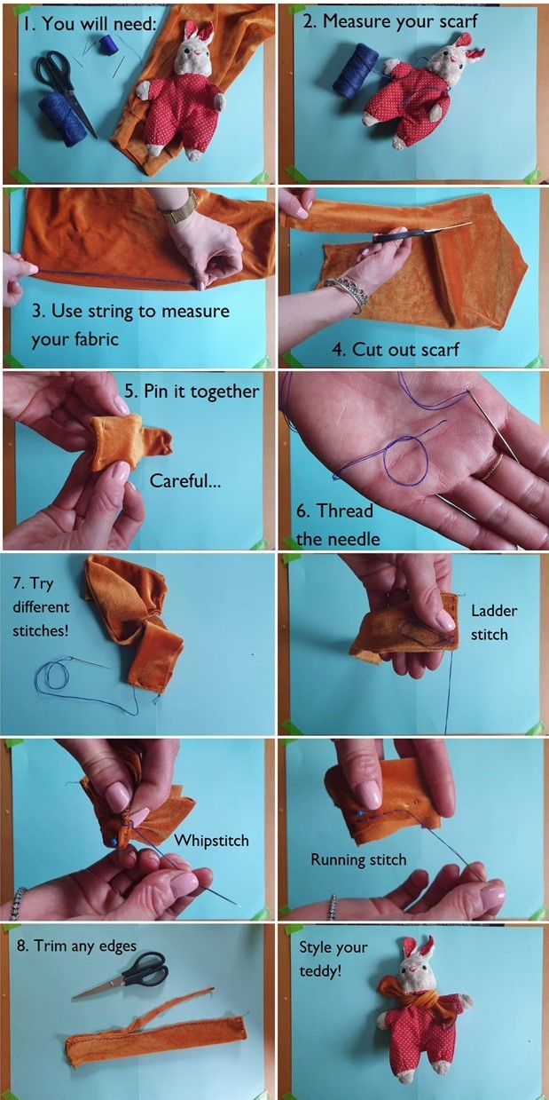 You could practise by sewing a button onto an old sock, or you could make something using old fabric – like the scarf we made for our teddy here.